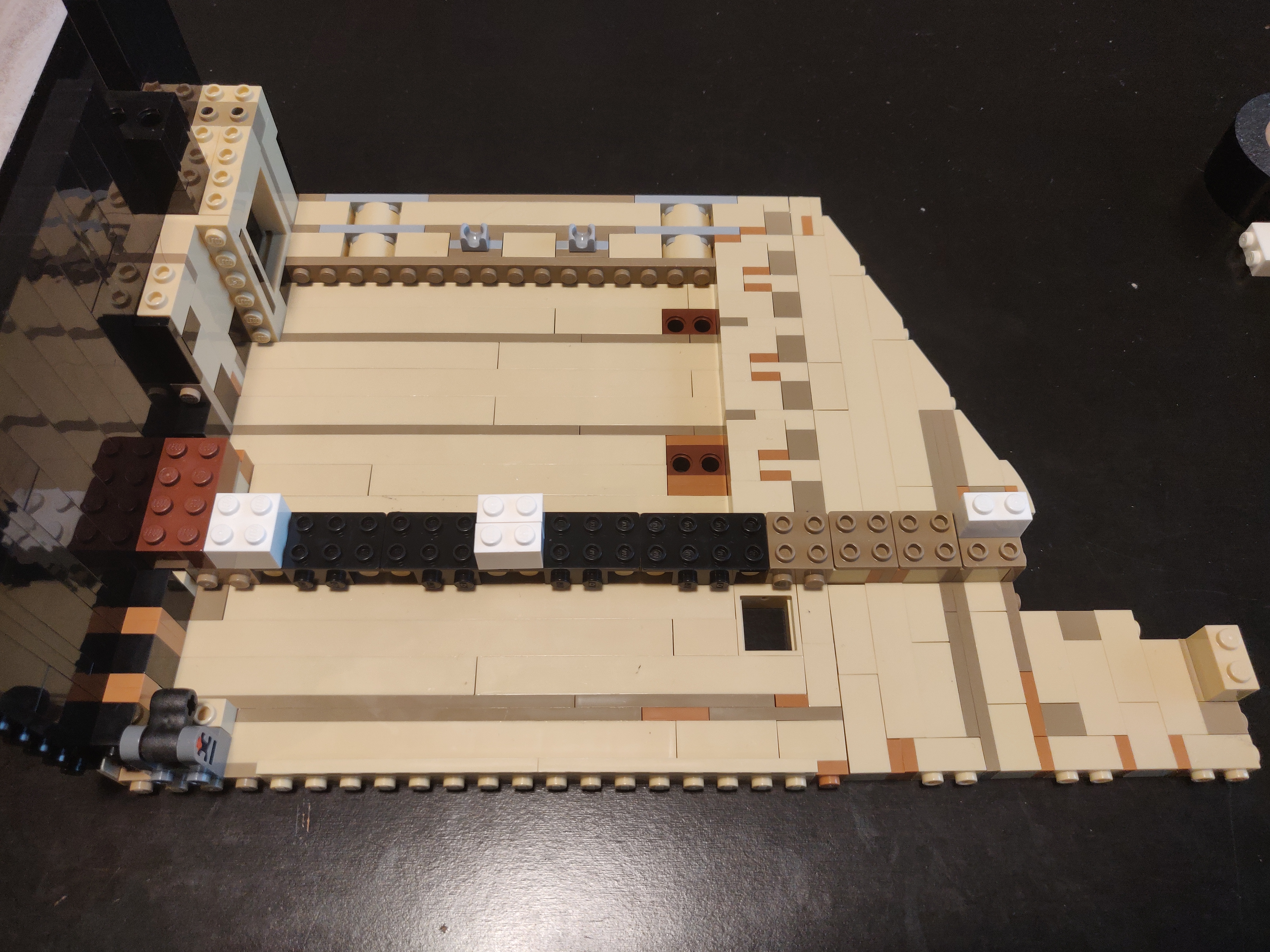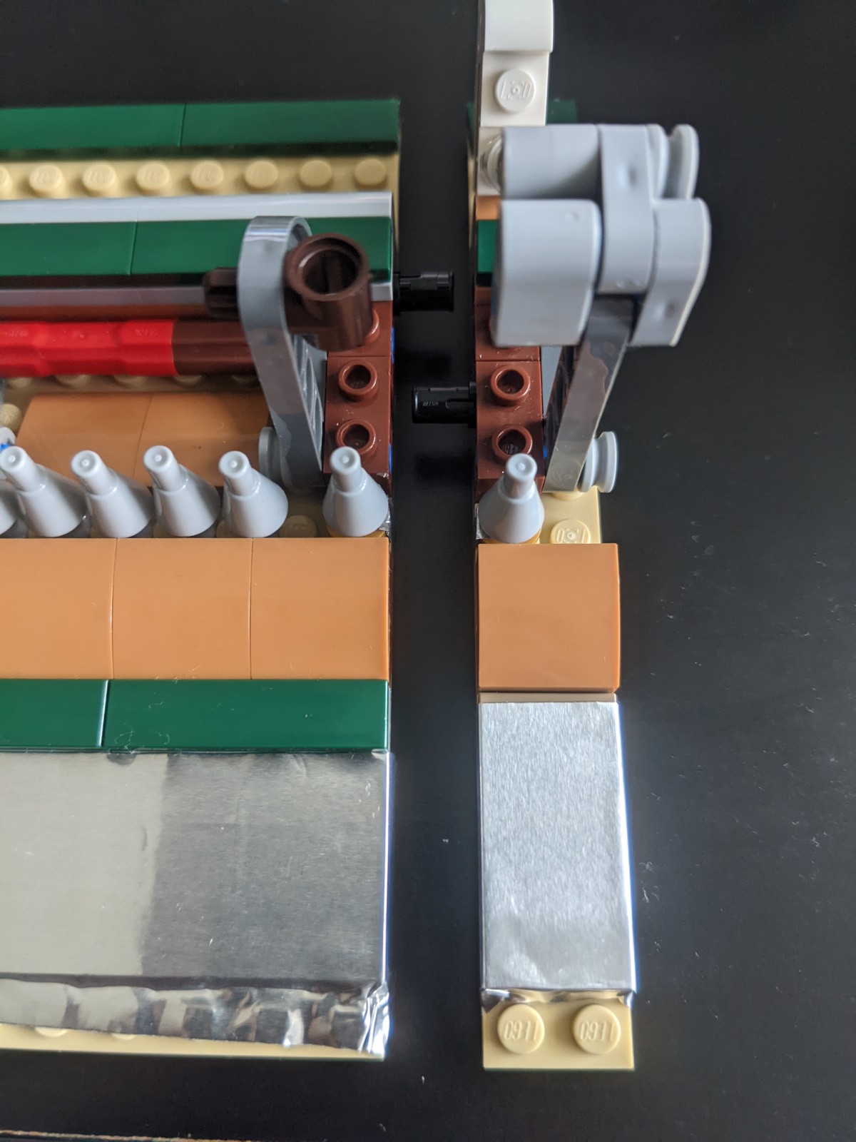 Now we get back to building the piano. Ignore the transparent tape on top of the keys in these pictures - these pictures were from the old switch design, but the steps from this point on are the same. We're going to build the rest of the Piano around the keys. Starting from the beginning, we omit the portion where we add the bracket for holding the power functions battery box included with the set (since we don't need it), but otherwise proceed as usual until step 76.