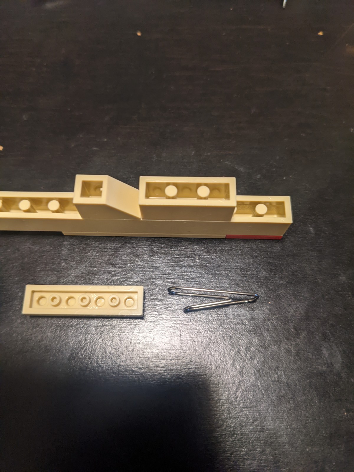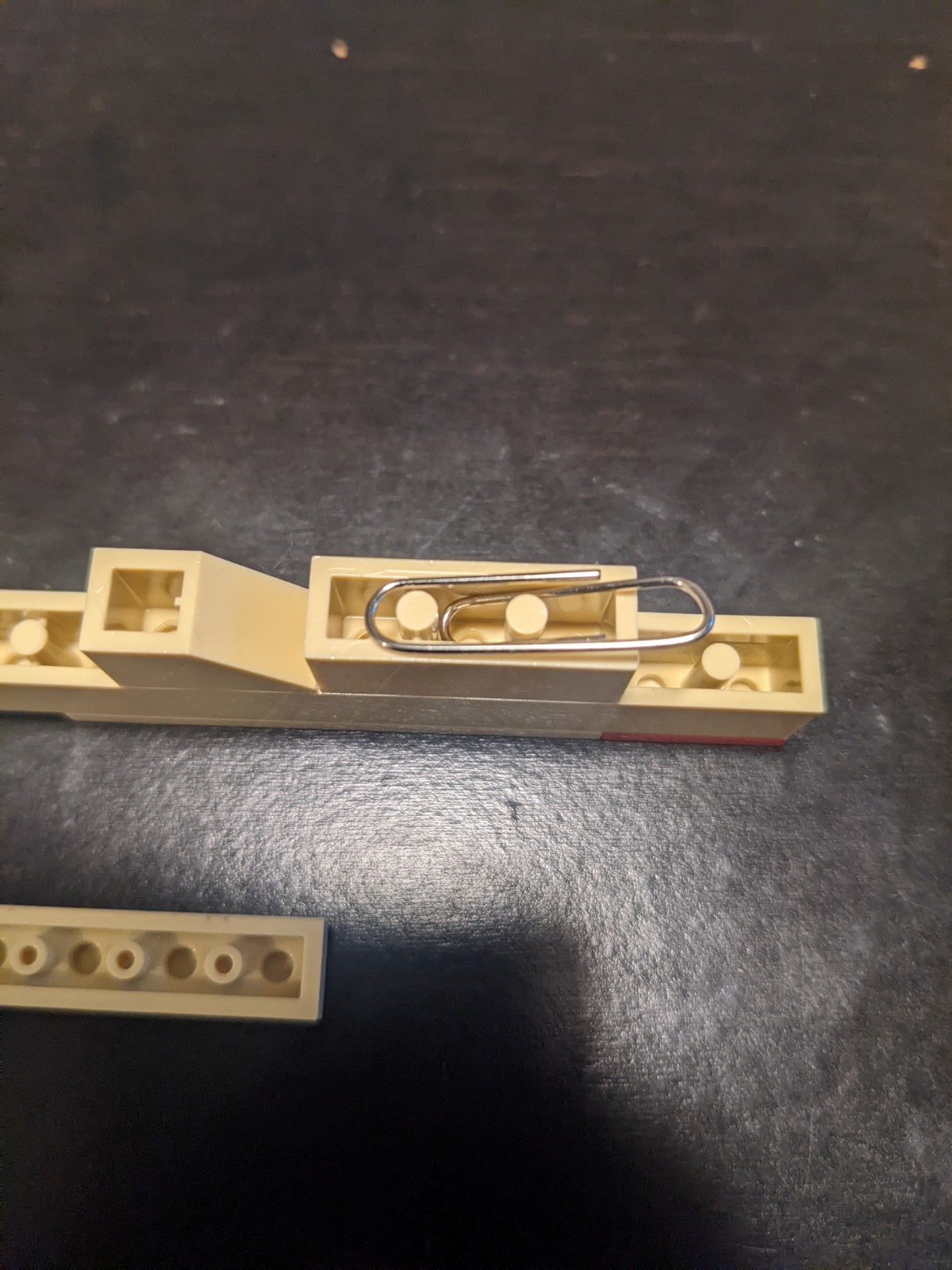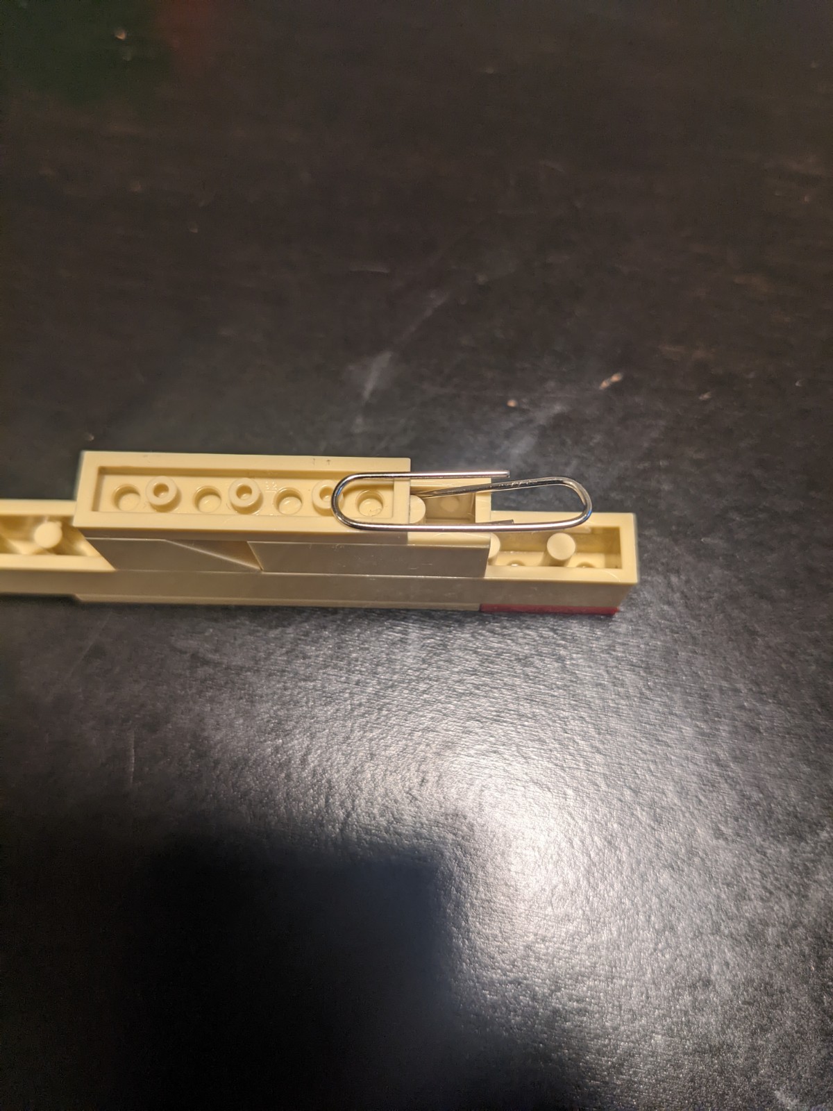 Slightly pry open a paperclip, so that it can lay within the 3x1 brick. Seal it in with the 3x1 plate between the sides of the paperclip