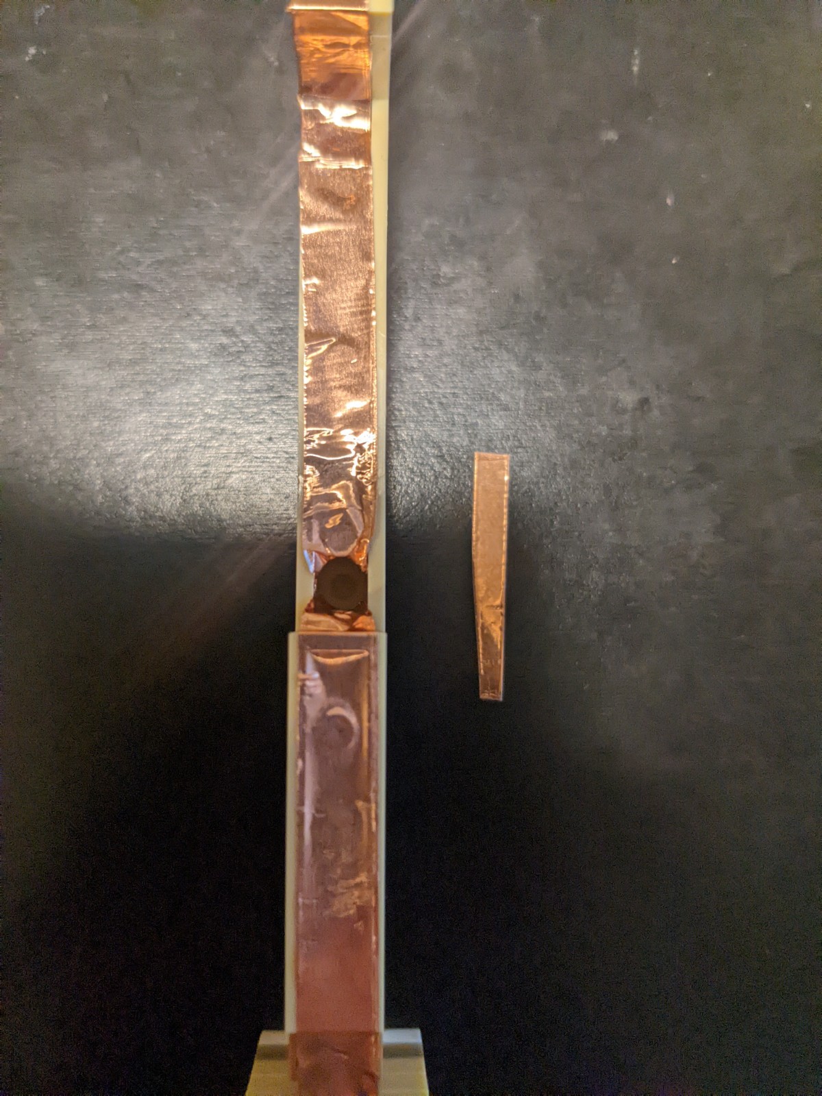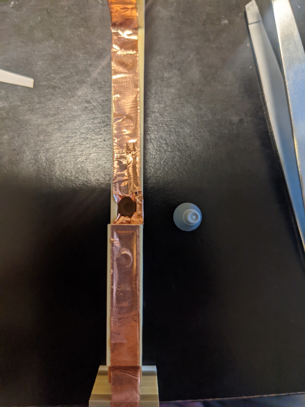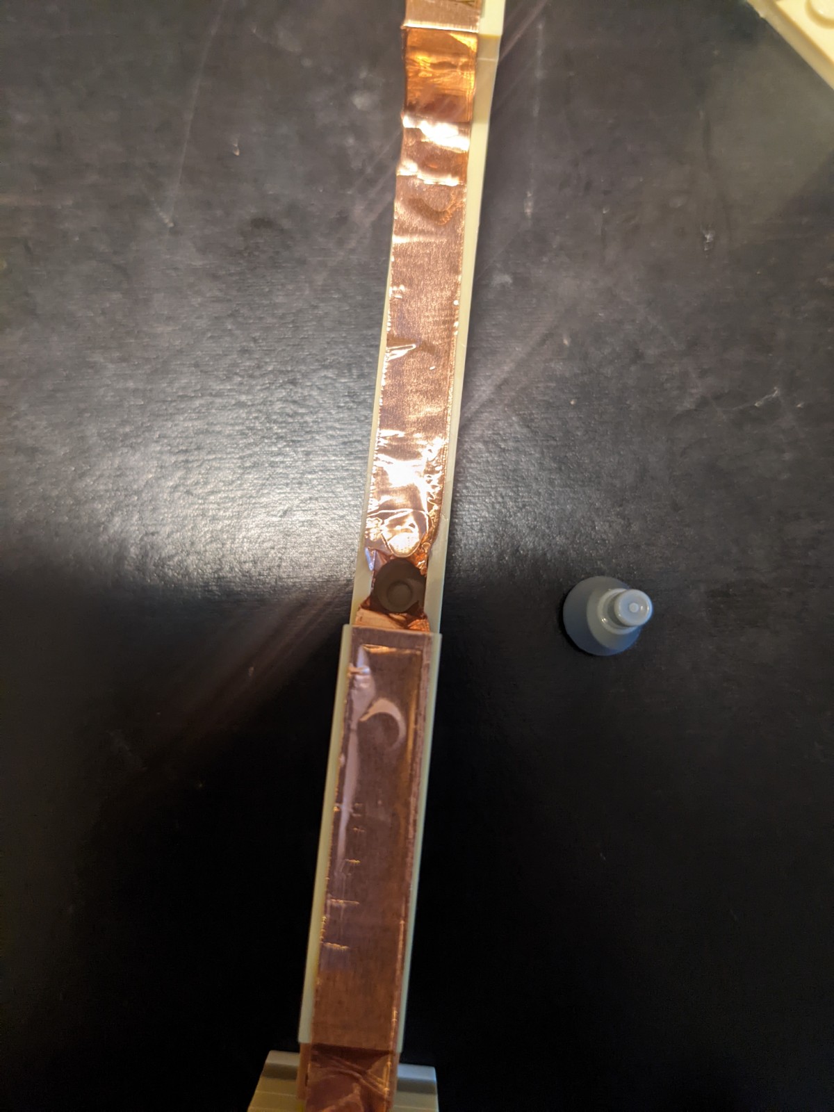The key idea behind the design is using copper (or aluminium) tape around the base and each key and connecting each key's tape to a GPIO output on the Raspbrry Pi to determine whether or not a key is pressed by checking whether or not the circuit was closed. This design results in keys which feel unchanged from those the original set, and hardware that can be built without needing to get a bunch of switches or printing a circuit board. In these pictures, I used a mix of aluminium and copper tape, but practically, it doesn't matter. If your tape is thin, it might tear easily - an easy fix for this is just to double up.